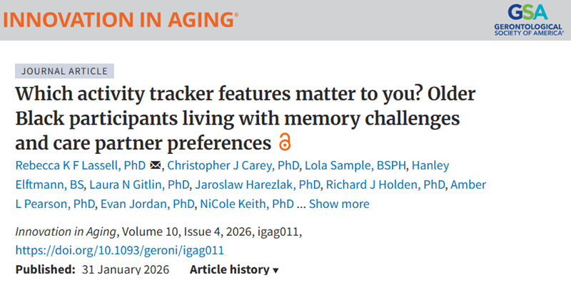 IMPACT Faculty Scholar Study Identifies Preferred Activity Tracker Features for Older Black Adults With Memory Challenges Posted on January 31, 2026April 22, 2026 by Josee Meehan Which activity tracker features matter to you? Older Black participants living with memory challenges and care partner preferences January 31, 2026 Continue reading →