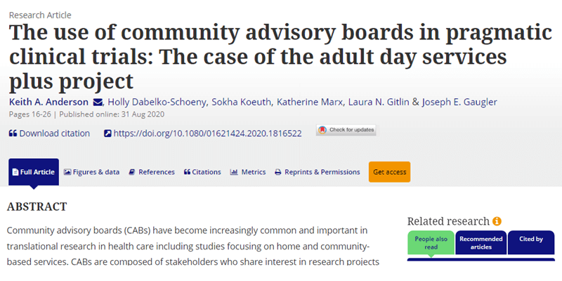 Laura Gitlin, PhD, FGSA, FAAN and Joseph E. Gaugler, PhD, leaders of the IMPACT Implementation Core are among the authors of a recent journal article examining the use of Community Advisory Boards (CABs) in pragmatic clinical trials. CABs have become increasingly common and important in translational research in health care including studies focusing on home and community-based services. CABs are composed of stakeholders who share interest in research projects and typically include patients/clients, practitioners, community members, policymakers, and researchers. CABs advise researchers on issues ranging from research design and recruitment to implementation and dissemination. In this article, the researchers detail their experiences with the CAB for a pragmatic clinical trail of Adult Day Services Plus, an education and support intervention for family caregivers of older adults with dementia using adult day services. Lessons learned, guidelines, and best practices are then presented for developing and working with a CAB in healthcare research.