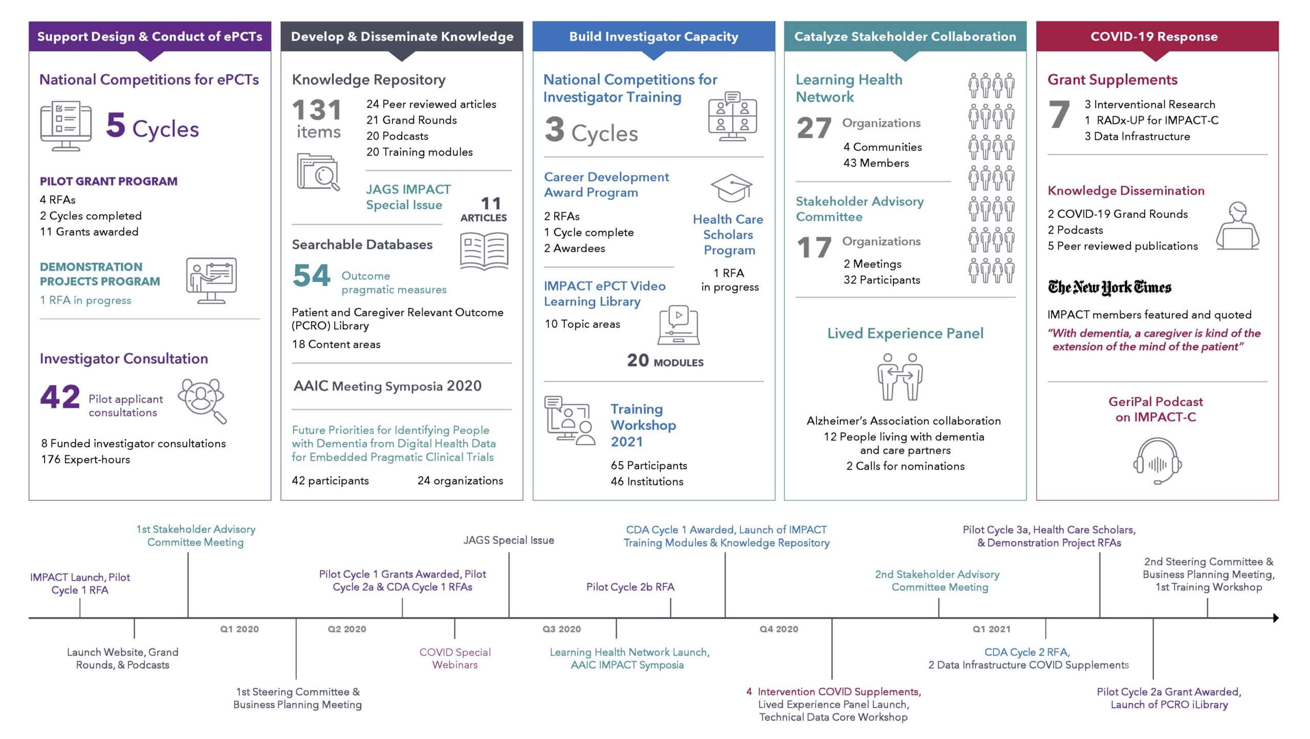 Highlights from the event include remarks from Richard Hodes, MD, the director of National Institutes on Aging, a Mission Moment presented by Brenda Nicholson, MD, retired physician and person living with dementia, and updates from IMPACT leadership. Presentations highlighted IMPACT activities, funded investigators, and research efforts related to COVID-19.